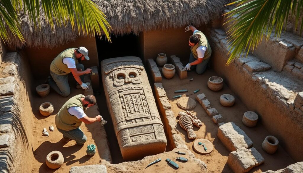 C’est grâce à une dénonciation liée à un cas de pillages que les archéologues ont pu localiser la tumba. Leur recherche a révélé un espace funéraire vraisemblablement dédié aux ancêtres, où des sculptures raffinées et des peintures murales captent l’essence de la culture préhispanique. Les découvertes incluent des représentations symboliques liées à la vie, à la mort et au pouvoir, ainsi que des inscriptions calendaires très précieuses.